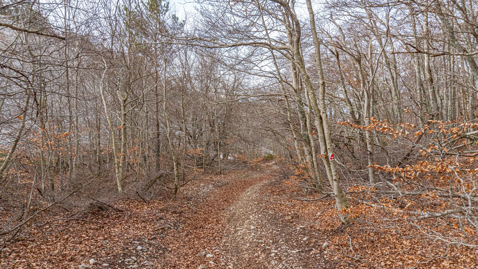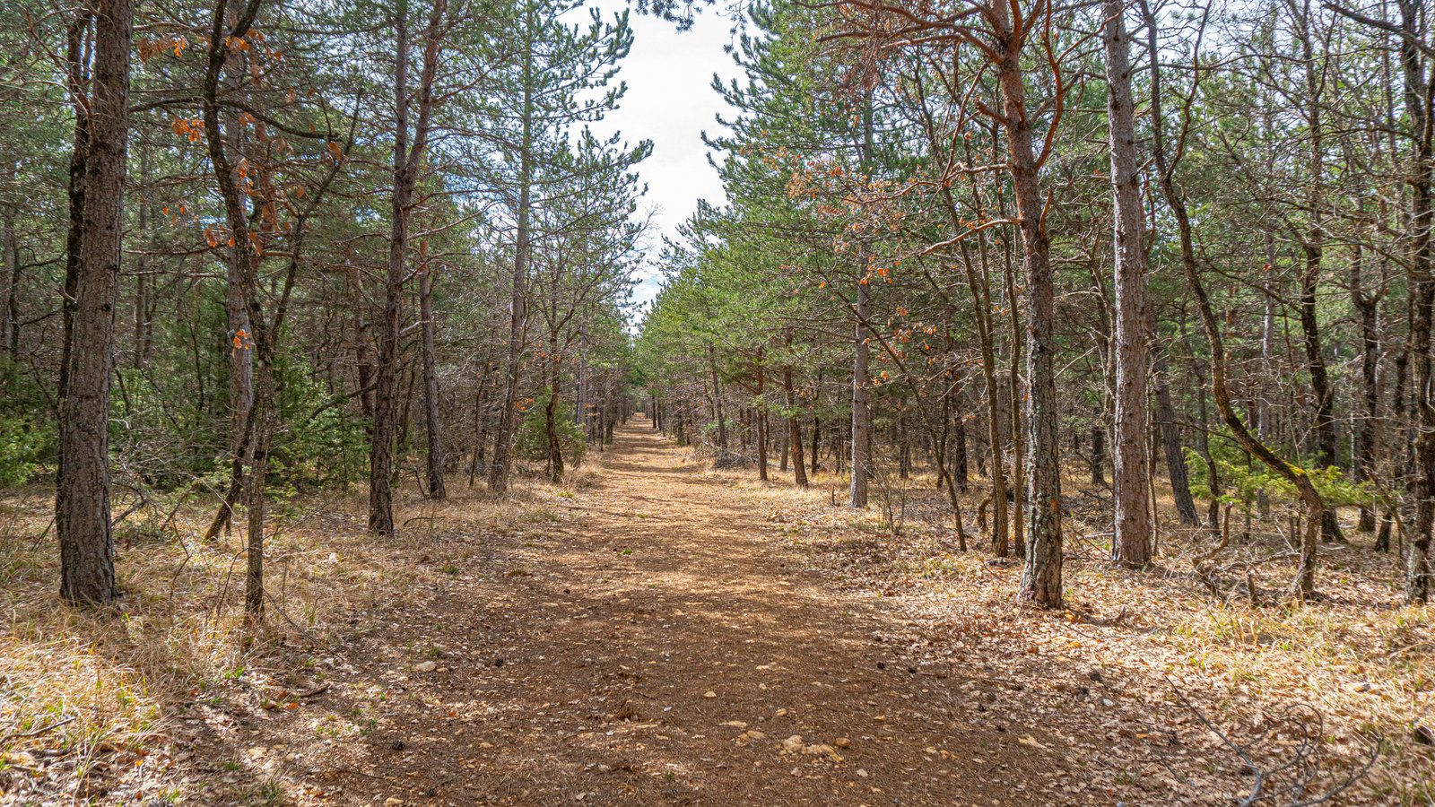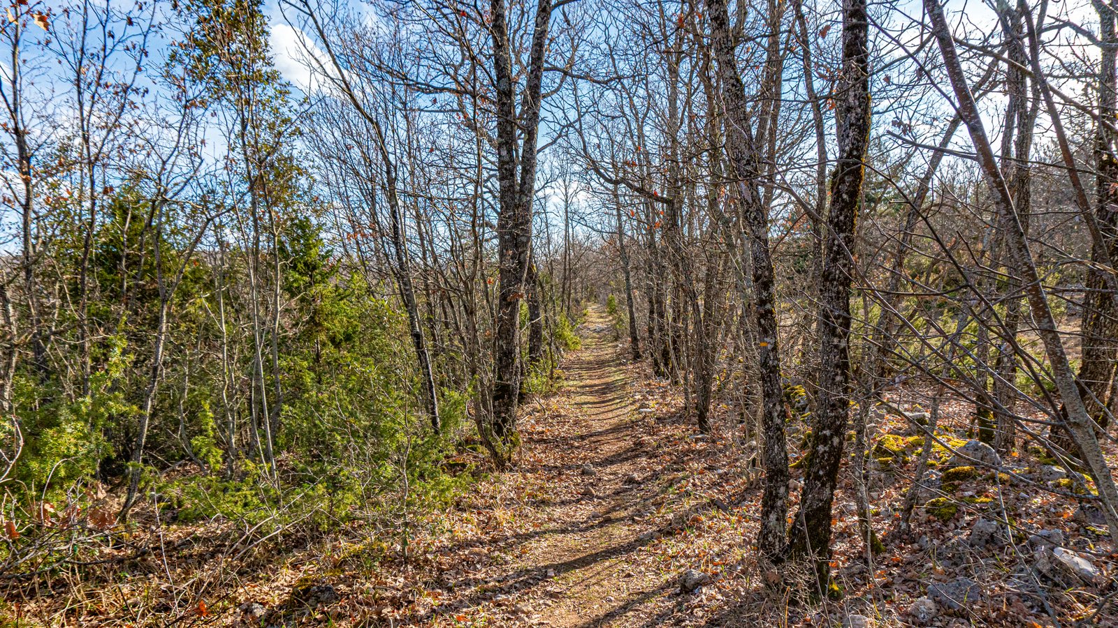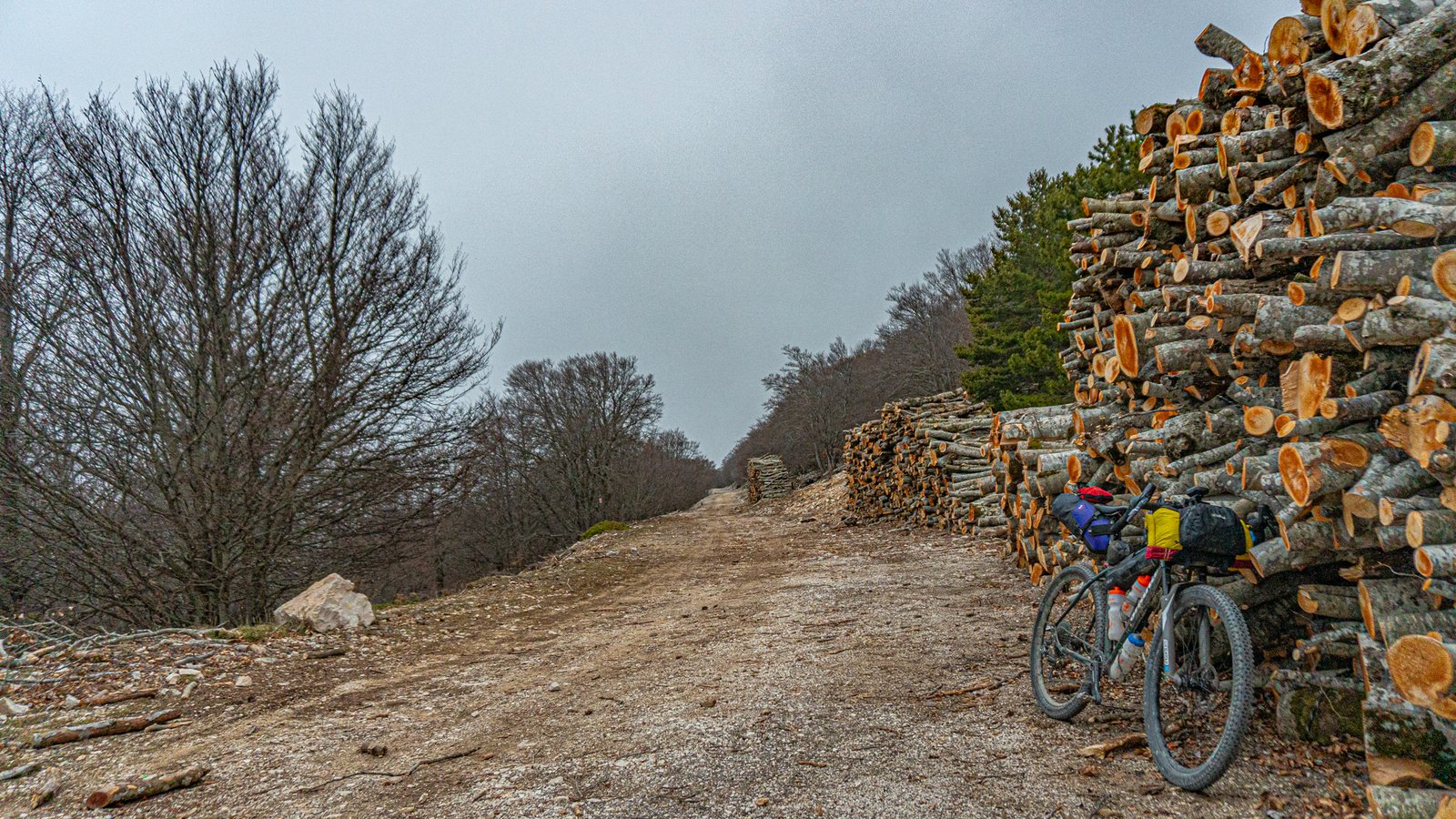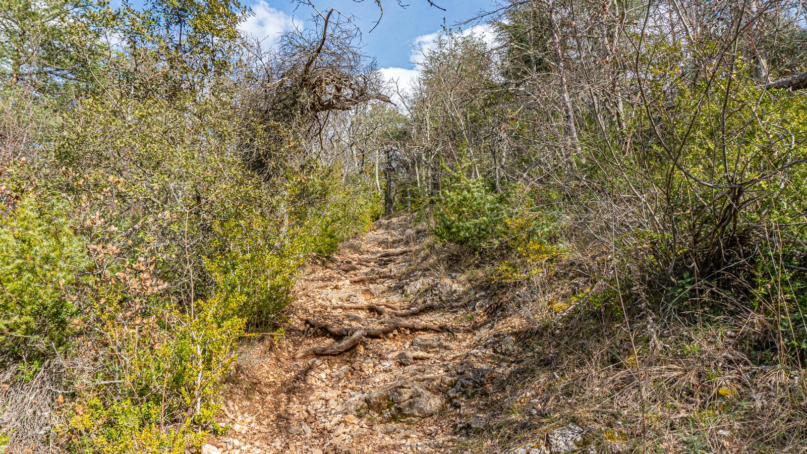 The trail heads south away from the road’s direction, becoming an open track past lavender fields, still bare stalks this early in the year, but in full bloom come mid June. The route continued along gravel tracks meandering through the forest, but this isn’t a gravel bike route, soon veering off onto more mtb appropriate singletrack.