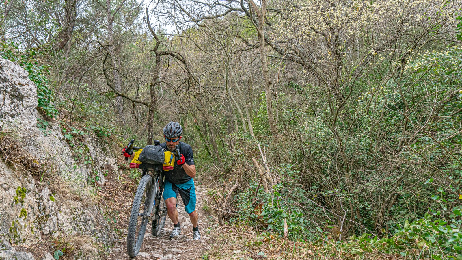 No sooner had you crossed over the stone bridge over the river and you were on the rolling tree lined trails, the early afternoon heat breaking through the dense forest. The route is well signposted with red triangular symbols, but it’s best to have the route on a gps too as a backup. Within a few kms was the first hike-a-bike, straight up a steep bank, a section of rope in situ to help people up! The loaded bike required both hand though to push it upwards, quietly glad that I had fitted the shoe studs, which provided much needed grip in the dirt (would suggest fitting shoe studs anyway as they help on the hike-a-bike sections, especially if it rains). It didn’t last long and the ridge top singletrack was the reward, with Mt Ventoux looming in the distance. The singletrack descent plunged back downwards along rocky, loose terrain. An exhilarating start!