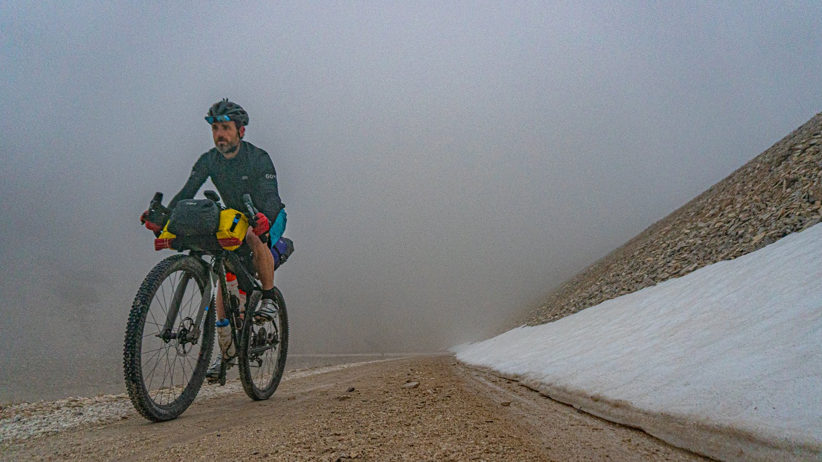 The climb starts gentle enough, settling into a constant gradient, but the loose, over sized gravel grabbed at tyres, legs pushing hard for the little reward in forward momentum. Once above 1000m the grand views started to fade behind the increasingly dense cloud that lingered around the summit. The higher tracks smoothed out at least, the effort having masked just how much the temperature had dropped, until I started to descend from the high point 130m above C.Reynard, the cold air stinging exposed legs and arms, soon having to stop to put arm warmers on. The lingering snow in more sheltered spots should have been a clue!