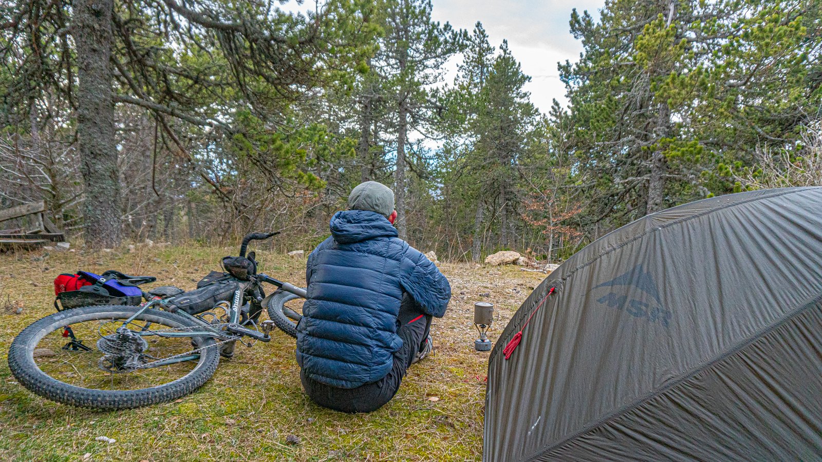 With curfew time closing in (not that anyone was going to be checking up here) and wanting to make the most of the vtt descent, riding it in daylight, I pitched the MSR Reflex tent amongst the trees within the small residential area, trying to shelter from the increasingly gusting winds as much as possible. A pitch further up the track would have offered a grand view, but fully exposed to those strong winds, which didn’t let up all night. At least it dried the overnight rain off the tent outer by morning.