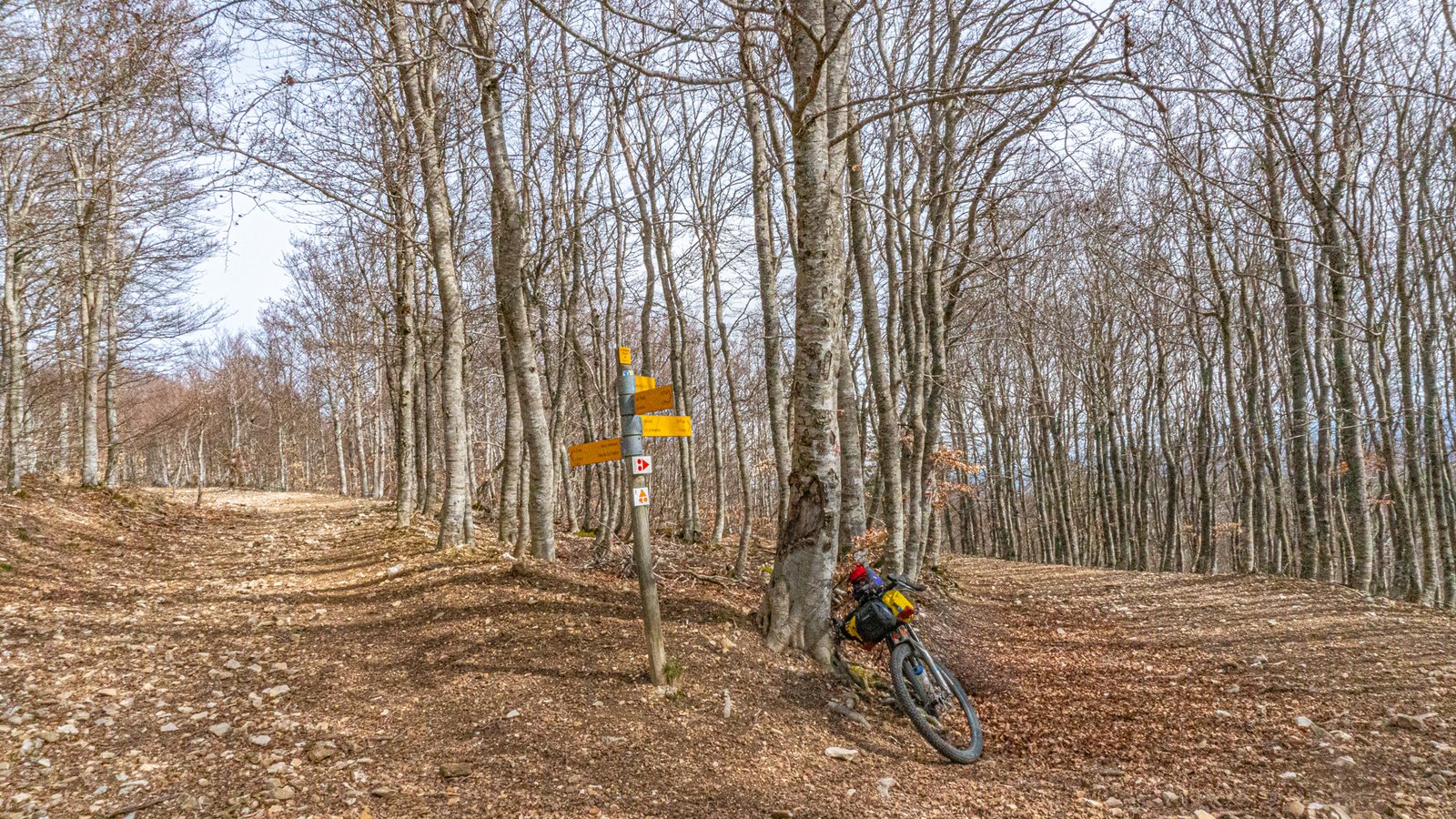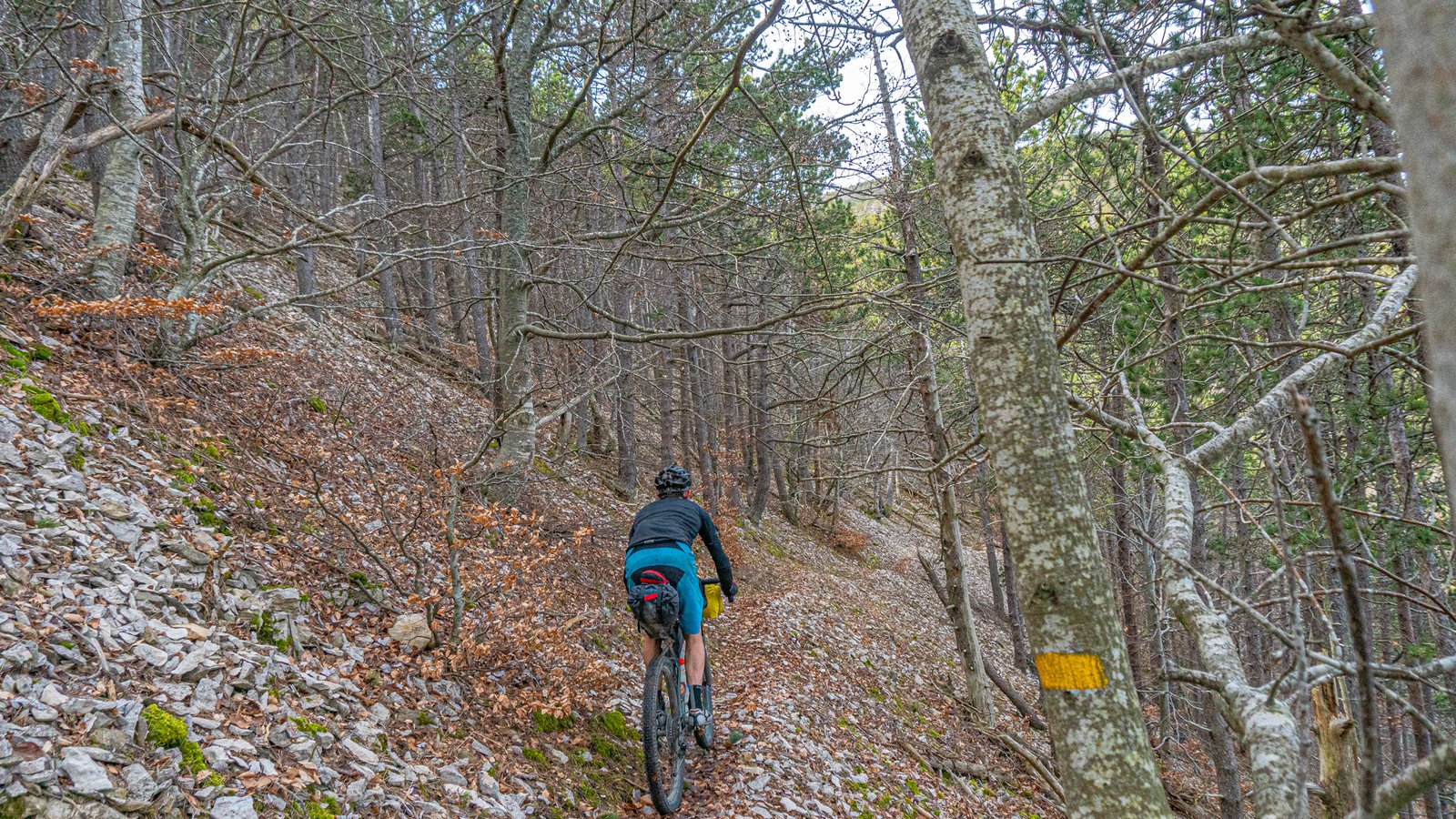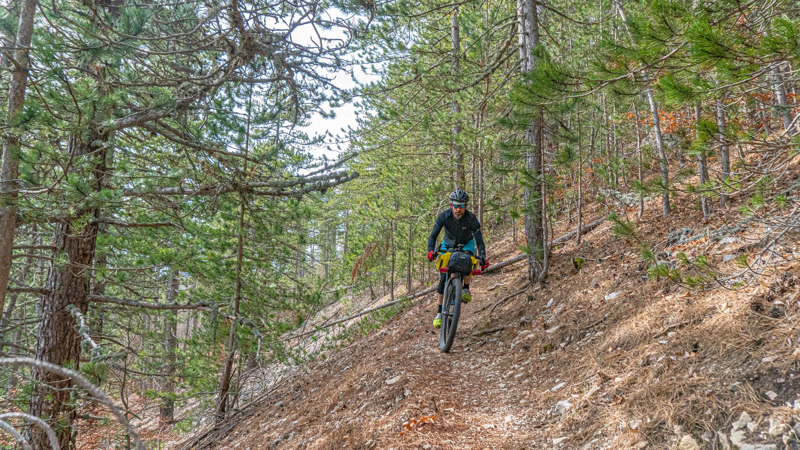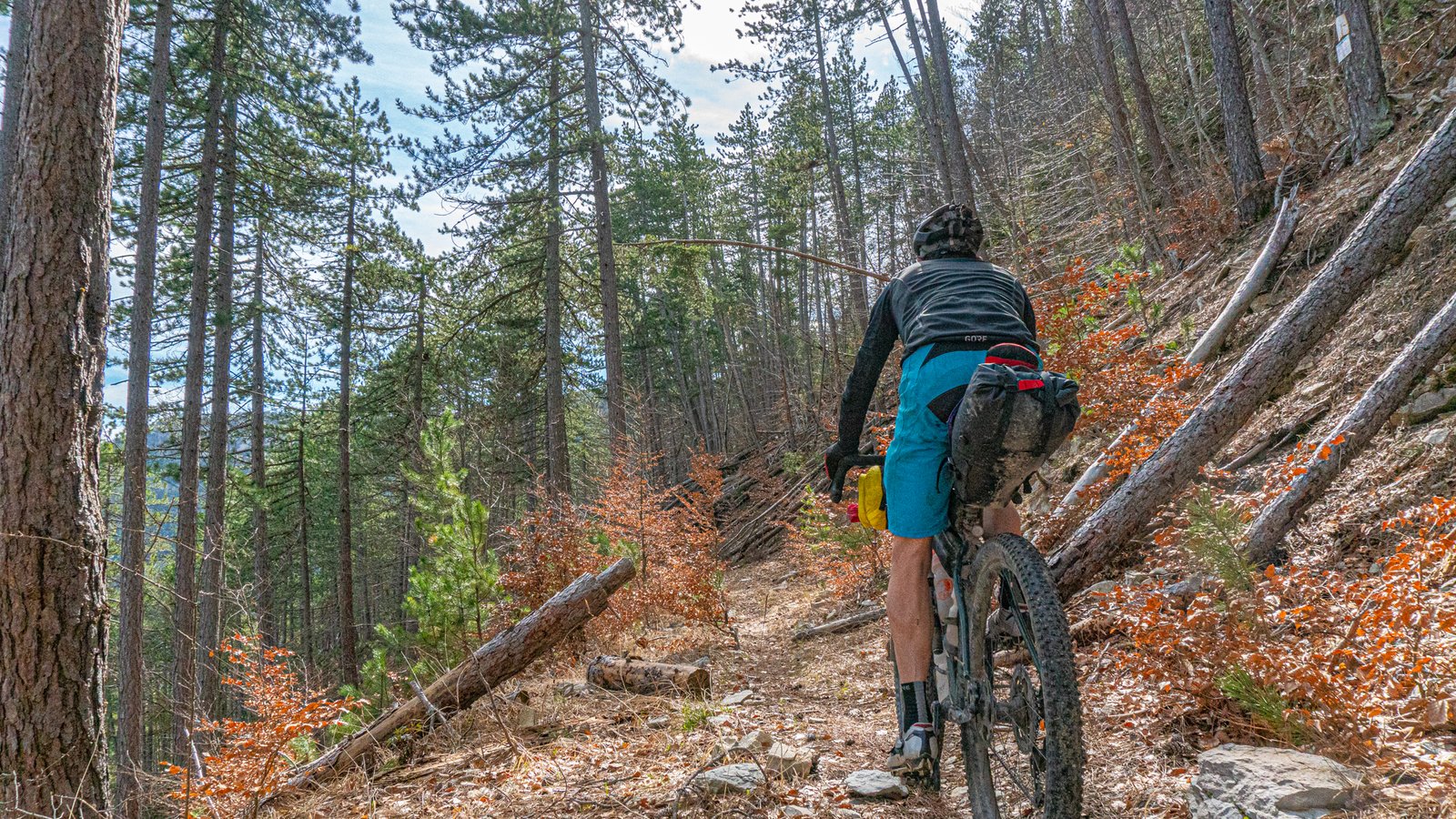 The forest track veered left at the top, a GTV sign pointed straight ahead through a gap in the trees. Where the forest road meandered down along the mountain’s contours, this trail dived straight down into the shallow gorge, hugging it’s rockface, along rocky, technical singletrack, across scree slopes, catching the tail end of the day’s light. No place for a tyre losing air! This became a theme of the GTV. Anytime a sign pointed back down through the trees after a climb, you broke out into a grin, in the knowledge that it was going to be an exhilarating singletrack ride back down.
